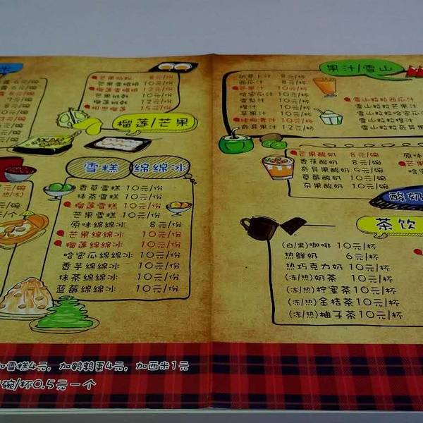 这家甜品店不是第一次来了,口味比较适合年轻人,多以水果为主的新式甜品,而且价格也不会很贵,比起很多什么满记那些大牌子来说,这里可以说是物美价廉,性价比高。环境也比较舒服,而且主要是在家楼下,很方便,有时候嘴馋了随时可以吃到。菜单是手绘风格的,很可爱,品种也比较多,分类比较清晰,除了传统的甜品,什么红豆沙,芝麻糊这些之外,还有意粉,披萨这些,任君选择。墨鱼丸,是外面超市卖的那种,中间放了沙茶酱,感觉墨鱼丸和沙茶酱的味道还是很搭配的。草莓酸奶,我原以为是草莓跟酸奶一起放搅拌机里打碎成糊状的东西,上来后看到原来酸奶是固体状的,不错的尝试。杏仁露,这个杏仁露很香滑,杯子好可爱呐。奇异果汁,12元一杯,很大一杯,看到老板是一杯用一只奇异果的,是新鲜的水果,但是喝了后发现应该是添加了一点蜜糖水的,因为不像自己在家里直接用果打汁那么酸。