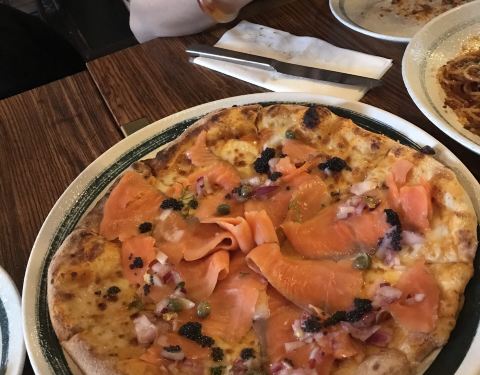 - 点了帕尔玛干酪和三文鱼双拼披萨,传统薄底是最爱,搭配鱼子酱口感更是鲜美