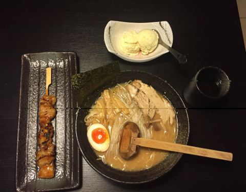 无意间搜到的高分商户 门面真心小 但上二楼却别有洞天 装修很日式 幽静的居酒屋风格 灯光昏暗 隔断很多 上完菜服务员会把你身边的帘子放下 私密性很强 菜单上的内容不算很多但基本的日式拉面全部都有 豚骨拉面 酱油拉面 盐味拉面 味增拉面任你选择 【豚骨拉面】 配的三块豚骨很入味 拉面很有嚼劲 汤底浓郁 喝得出是原汁原味烧出来的 另外配料笋干也是亮点 【鸡肉串】酱烤的 酱汁味道甜蜜蜜的很棒 香嫩可口 【鸡胗串】边上有些焦 鸡胗口感有点老了 也不入味 总体而言 不起眼的日式拉面 小店大味道