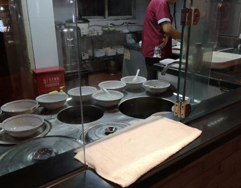 今天早晨未吃早饭,从宏村赶到了屯溪,就是冲着汪一挑的名气而来。汪一挑店面雷同于老街的老建筑,彰显徽派风格,店内装修还是很好的,屋顶吊着许多灯笼,既是照明,也是装饰,很好看。八仙桌、方凳子,给人一种怀旧的感觉。入座后,咨询了服务人员哪些特色小吃好吃,遂点了12元一碗的一挑大碗馄饨、22元一笼5只的牛肉三眼蒸饺和20元一客的葛粉圆子。由于店内就我们两人就餐,馄饨和三眼蒸饺都要手工做出,所以等了约20分钟,食品陆续上桌。品尝后,觉得葛粉圆子既糯又滑,很有特色,确实很好吃;馄饨馅的味道也不错,只是汤料不行,清汤寡水,虽有榨菜末垫底,依然显得乏味,也不鲜,是否可以考虑改用熬制的骨头高汤;至于三眼蒸饺,则应该给差评了,馅不鲜,底还破,索然无味,很是失望。另外,店内苍蝇较多,无时不在打扰,好心情也会受到影响的。