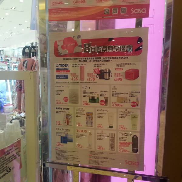 澳门有大约8家sasa的分店,其中一家就在金沙城中心的二楼购物大道里面。因为位于金沙城中心里面,所以交通非常便利,可以乘坐金沙城的免费穿梭巴士达到,也可以乘坐新濠天地和威尼斯人的穿梭巴士,然后走到金沙城中心那边。如果真的是没有穿梭巴士了,也可以乘坐15; 21A; 25; 26; 26A; N3到连贯公路/金沙城中心-公交车站下车,步行几分钟到达。这家sasa在澳门算是比较大的了,而且基本的品牌都相当齐全,其它sasa分店该有的,这里也有提供。这里出售各类香水、护肤品、化妆品、面膜、洗发水、沐浴露、身体乳、卫生巾、化妆棉等等的用品。由于这里的面积比较大,在店铺的最里面还有提供给客人休息,试用产品的桌子和椅子。这里的服务态度还是挺不错的,因为这里的客人不多,所以每次你进去的时候都会咨询你要些什么东西,不会像在新马路那边那些完全忽略你,或者没有空理你的。而且也因为这里的人比较少,所以无论你什么时候去购物,结账都是不需要排队的,我试过最多人的一次,也就是有两个人在前面,不像新马路那边的sasa,结账都要排队排个5-15分钟。所以如果不喜欢和别人挤的游客,可以选择在金沙城中心的sasa购物。和其它sasa一样,每个月都会有一些会员特价产品,每个有sasa会员卡的会员都能以超低的价格去购买指定的产品。而且除了每月的特价产品以外,这里还有每周特价产品,有兴趣可以多多留意,可以买到超低价格产品哦!