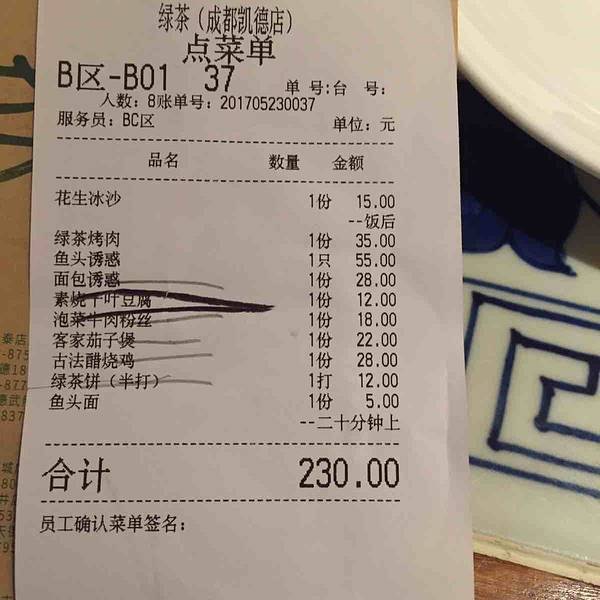 成都有2家绿茶餐厅,一家在市中心春熙路上的太古里,还有一家在南门火车南站旁的凯德天府商场里,这一次来吃的就是这家天府店。凯德天府是新修的一家商场,最方便就是坐地铁1号线在火车南站下,商场离火车南站很近,餐厅就在商城的6楼。中午来吃的饭,生意很好,都坐满了,晚上来吃的话一定会排队的,餐厅外面都有一排的2人桌,也是坐满。餐厅装修很不错,很小资,都是以木头为装修风格,然后以暗色调为主,在餐厅外面不觉得,走进去发现里面还挺大的,有很多4人桌。里面的服务员都感觉很忙碌,快速的点菜,在生意那么好的情况下,上餐还是挺快的。推荐的菜品有绿茶烤肉,35元一份,是这里的特色菜,烤的肉是五花肉,一半瘦一半肥的那种,放在一个铁盘上烤,铁盘上有纸,铁盘下有小火,可以多烤一会,吃起来更香,再配上特制的蘸酱很不错。鱼头诱惑,35元一份,这是一份湘菜,也是来这里的必点菜,一份鱼头很大,上面还有很多鱼肉,鱼头上铺了满满一层的鲜椒,但是并不是很辣,但是吃起来味道很香,点这个菜的时候必点一份鱼头面,5元,面是煮好了端上来的,和鱼头一起吃。素烧千叶豆腐,12元一份,是用鱼豆腐做的,切的很薄一片,个人很喜欢这个味道,吃起来很入味。古法醋烧鸡,28元一份,鸡肉都切的比较小一份,整个菜是带酸味的,吃起来还是很开胃的。绿茶饼,可以点一打或者半打,一般点半打就够了,半打都有8个,绿颜色的小饼,周边裹着一圈芝麻,很不错的一个小吃。推荐2个必点的甜点,一个是面包诱惑,28元一份,这个是每桌的必点菜,面包烤制出来的,上面有冰淇淋,冰淇淋和面包一起吃,面包外皮很脆,冰淇淋还可以另加。还有一个是花生冰沙,15元一份,可以告知服务员饭后上,花生酱打出来的冰沙真的很香,一份冰沙也很大,千万不要一个人点一份,完全吃不完,几个人吃一份都够的了。这里人均消费大概50元一个人,每一份菜的份量还是比较多,相对于用餐环境和菜品质量来说,价格还是很划算。整体用餐很满意,环境也很好,去吃晚餐的话要提早点去排队,值得推荐的一家餐厅。