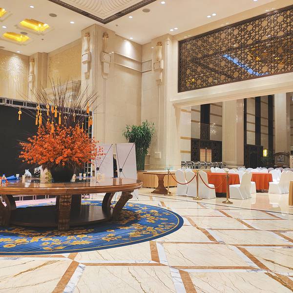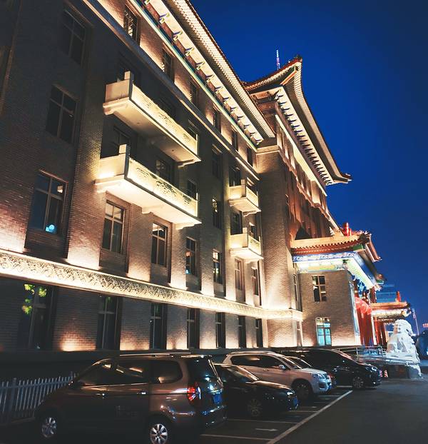 #点评召集令# 从太原武宿国际机场出发到市区,除了机场巴士1号线(16元),更省钱的方式就是搭乘公交201路(2元)。它途经火车站,有22站的路程。下了公交,步行一会就到了学术会议地点 —— 并州饭店。旁边是个广场,跟长沙河东繁华地带的名字一样,“五一广场”。广场上有座显眼的雕塑,一对少男少女,身边还有两只小鹿。男生纵情奏笛,女生仰望长空。资料显示,这个雕塑的名字为“晋泉之声”,雕塑的神态预示着渴望太原经济腾飞的到来。饭店前的树展露入秋的姿态,青绿相间,几乎占据了我的整个视野。并州饭店作为建国初期太原市最具代表性的十大建筑之一,确实名副其实;集唐代建筑风格与现代风貌于一体,古朴典雅气息与现代气息完美融合。门前八根红色大柱与四个红灯笼喜气洋洋,在冰寒中给人带来一丝温暖。明亮的灯火清晰地照亮酒店悬挂的牌匾,上面的文字苍穹有力,彰显了酒店所经历的40多年历史之久远。酒店门口左右分布立有两座石狮,尽显威严。酒店内部装饰地富丽堂皇,吊灯、瓷砖等物品散发着奢华的气息。年会会议的组委会人员在酒店内忙着参会人员的注册,并会发放一个装满东西的袋子。自助晚餐的菜品种类繁多,其中烧烤肉串有鱿鱼串、鸡肉串和兔肉串。