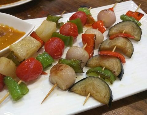蕉叶烤开边鱼,鱼肉烤的很香嫩,酱料也入味,比预想中的好吃很多。 烤时蔬拼盘,都是很健康的食材