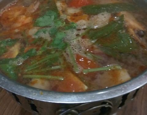 第一眼看到荣会的时候,还以为是家酒吧,走进去才发现原来是一家泰国菜餐厅。店家靠近门口的地方的确是一片吧台区域,而大厅的装修则很书卷气,看起来很像是某人家的客厅。 小食拼盘配芒果沙拉,四种泰式小食中有三种是油炸类的,搭配两种口味的酱料,还有爽口的芒果色拉,很开胃的餐前小吃。 大虾海鲜冬阴功汤,鲜咸爽口。 蕉叶烤开边鱼,鱼肉烤的很香嫩,酱料也入味,比预想中的好吃很多。 烤时蔬拼盘,都是很健康的食材。 主食点了一份九层塔鸡肉炒饭,大概是有九层塔这道香料的原因吧,这道炒饭很香。 临走的时候去了趟洗手间,发现原来这里的卫生间也别有洞天,被店家装修的好像是一个女孩子的闺房一样,尤其是洗手台,真的就是一个女孩子的梳妆台。