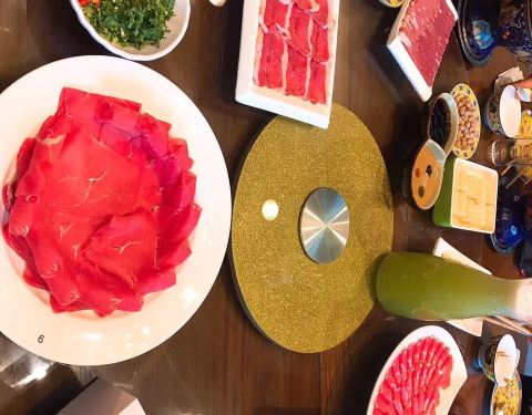 餐厅进门的金字招牌特别显眼,整体的装修风格类似宫廷风,以象征尊贵的金黄色和喜庆的大红色为主。区别于其他火锅店,单人单锅的小锅形式非常精致而且卫生,锅的花纹也特别华丽,最重要的是种类众多又新鲜的肉类,肉质鲜嫩而且没有膻味,蘸上特制的麻酱小料,味道真是非常棒。