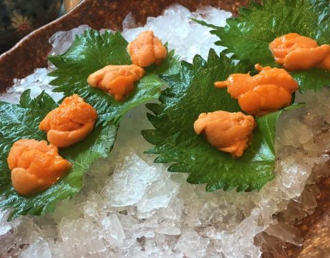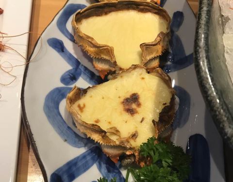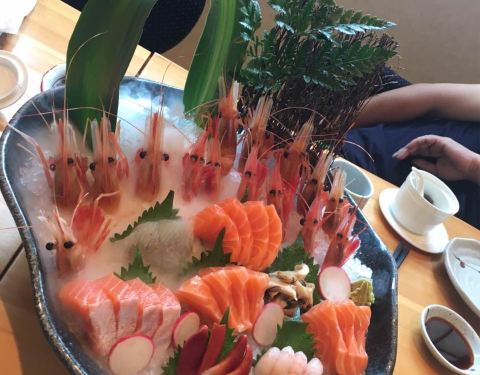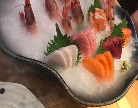 服务非常好,摆盘丝毫不马虎,最后刺身只要了几片,竟然还是按照标准刺身拼盘的规格,叶子花碎冰一点点铺好的。 两人位子也是一间间隔开的,座位宽敞,私密性很好。 刺身切片相当厚实,甜虾新鲜个头很大。 铁板烧...