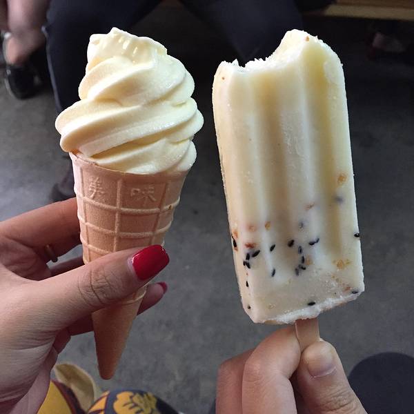 我俩本想吃完溜溜食,就看见家家门口的香灰直接往眼睛里吹,大风让店家都在收东西,一看就是要下大雨!!!! 我俩决定返回四方街中心,去吃个冰棍躲雨 ps:四方街就在喜州,不要门票,进去就能看见四方街食店,食店旁边就有两家卖粑粑的,不相上下,再旁边就是清凉小屋 清凉小屋的冰棍,适于1850年左右 特别好吃,就是妈妈那个年代,冰棒的味道 要了坚果冰棒和经典冰淇淋。 临走要了酸木瓜黑糖味,这个最好吃!