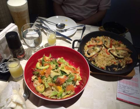 鹅肝牛排,要了5分,味道不错,鹅肝两块蛮大,牛排两块稍显少了点…牛排米饭,放了蟹黄吧,有蟹味,还不错。餐前面包,好吃的,真想再来一份,可惜吃不下了…色拉好大一个碗,瞬间感觉里面的菜量好少…桌子上的按铃没有反应,举手也没人看得见,只能用喊的…