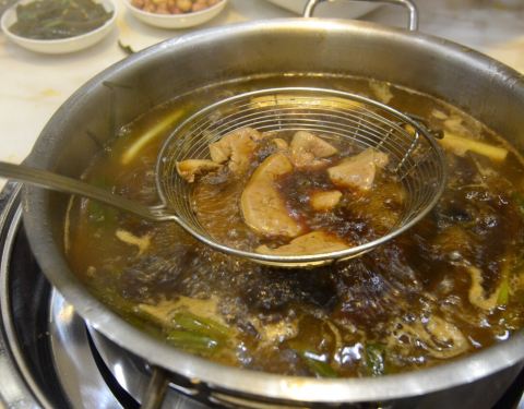 说起吃高兴一锅我总想着他家的潮汕牛肉锅,那个味道啊,好喜欢的。 这次朋友聚会来的这家说是吃潮汕的卤水火锅,不是吃鲜牛肉的,是卤水火锅,卤水的哎~没有听错吧,以前没有尝试过哦~ 这家分店第一次来,底楼大厅,楼上包房还是很雅致的,服务生小伙子态度不错,跟我们介绍卤水锅的吃法,他家也是有石斑鱼、各种新鲜海鲜的,但这个卤水锅另外有菜单配,锅底汤色深味道咸鲜,很正点的潮汕口味。一般来说不沾调料吃比较赞。鲜鹅肠、生鹅血、鲜鹅肝、扒皮鱼、九肚鱼啥的特别受欢迎,刷出来的味道很好吃,热的卤菜呢~ 另外虾、鱼、丸啥的海鲜依然可以烫,一样鲜美。他家的蚝仔龙头烙是我最近吃过最好吃的,正点,新鲜润滑最最赞了,他家的秘制虾枣也是做的很棒的,这两样就让我回味,哦,还有那个鲜鹅肝…原来也是辣么的美味啊!