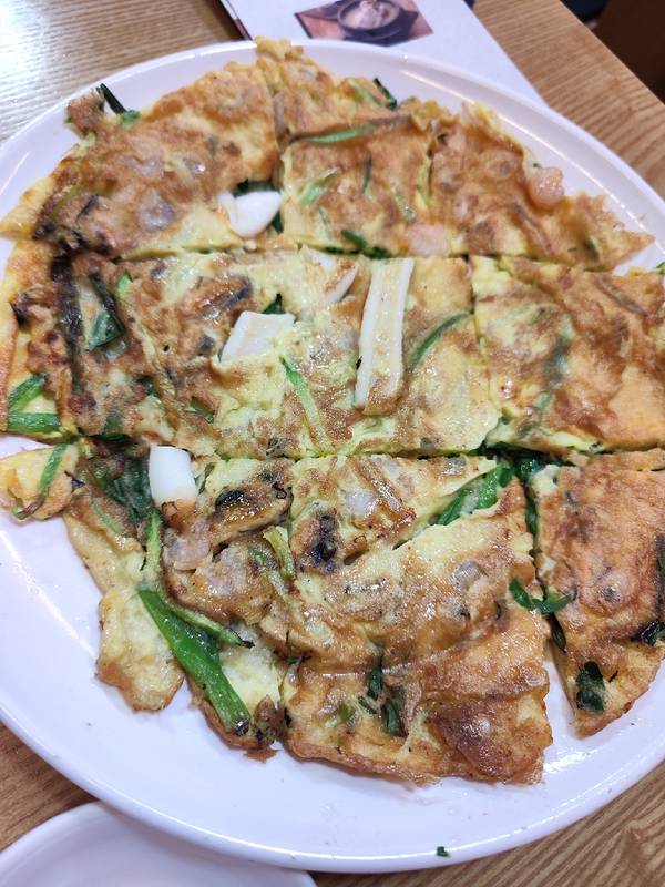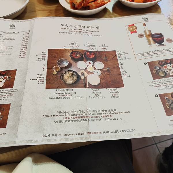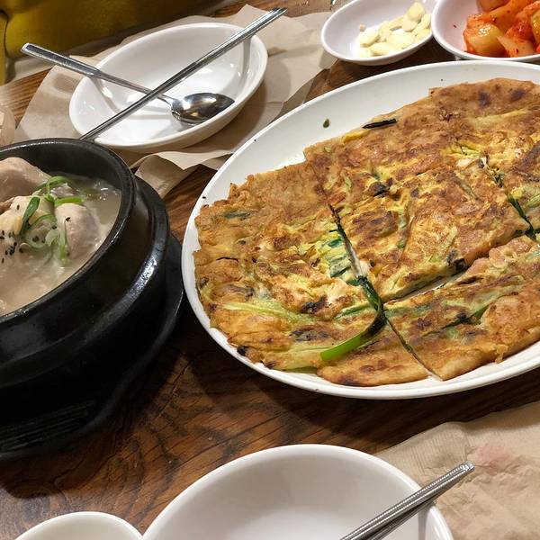 终于来到这个土俗村参鸡汤啦,之前来韩国就没吃到这家了,这次来体验了,整体感觉一般般吧,比我期望值要少很多,上来先是一杯参酒,鸡肉倒是很嫩的,应该是一只小鸡,里面塞满了糯米跟人身,我倒是挺喜欢吃这个...终于来到这个土俗村参鸡汤啦,之前来韩国就没吃到这家了,这次来体验了,整体感觉一般般吧,比我期望值要少很多,上来先是一杯参酒,鸡肉倒是很嫩的,应该是一只小鸡,里面塞满了糯米跟人身,我倒是挺喜欢吃这个海鲜饼的,口味不错。