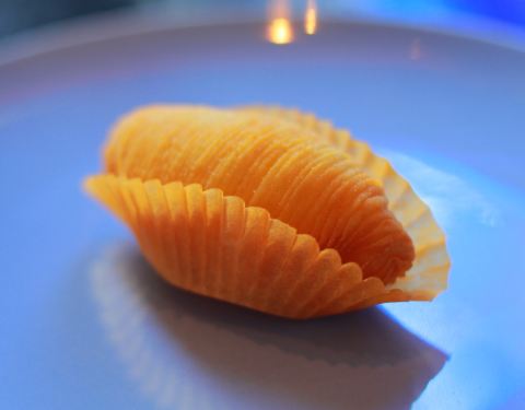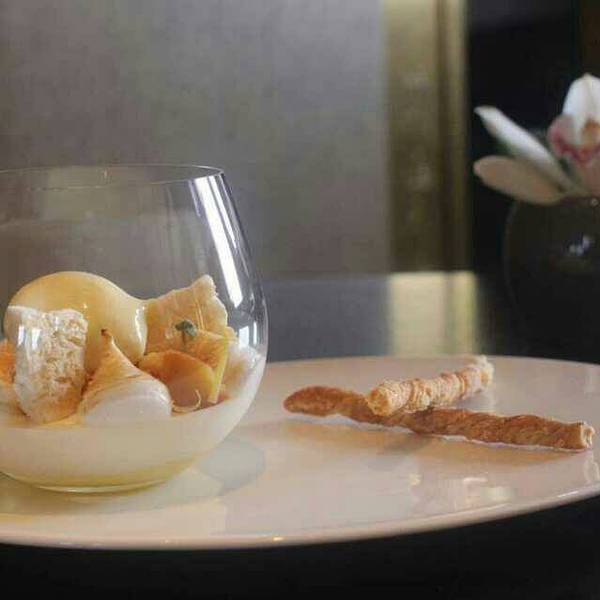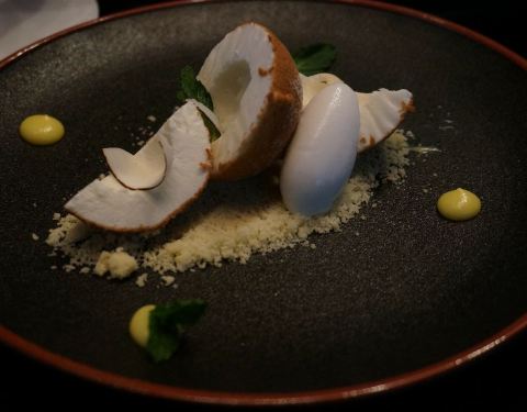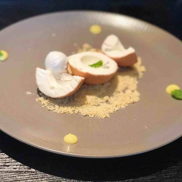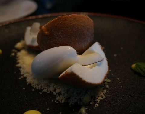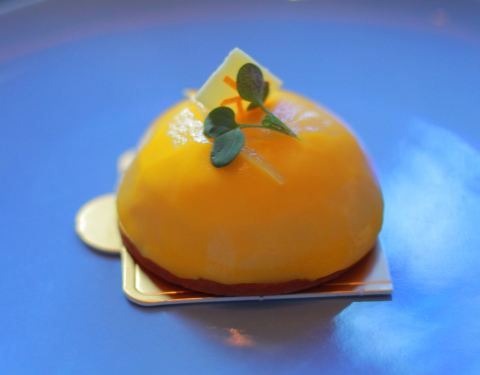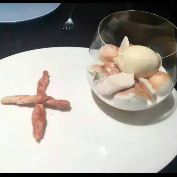 ...这个最后的甜点太赞了~ 餐前小点- 算分子料理吧,里面qq的像黄桃果冻,上面咸咸的不知道是什么