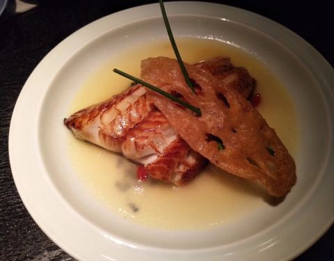 ...口感清爽的前菜,柚子配嫩鸭,偶尔一口又能惊喜的吃到松子粒,最上面做点缀的那片炸莲藕也一点不多余