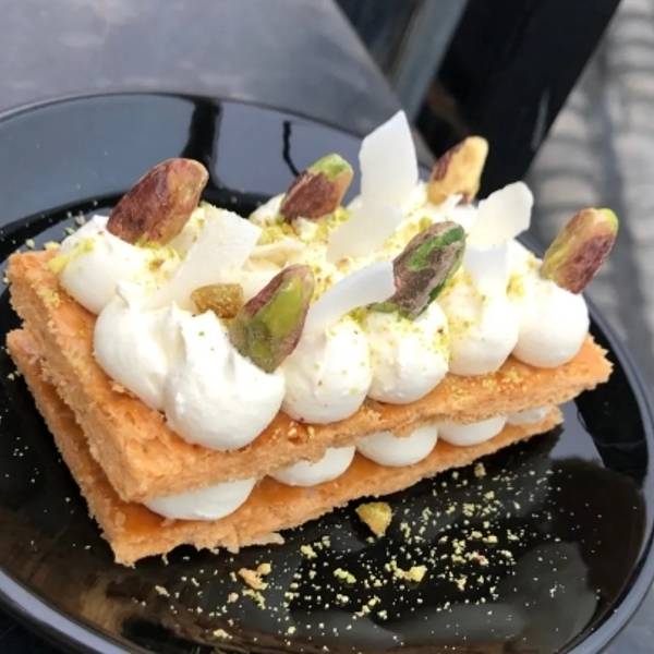 椰子拿破仑酸奶口味加上椰子碎的拿破仑真的很好吃,就是吃起来不太方便哈哈哈哈