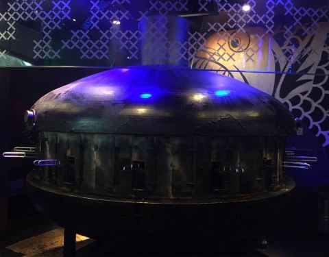 餐厅夸张的墙饰和时尚张扬的装修,一打眼以为是咖啡厅。颇具"UFO"气质的烤炉,圆滚滚的肚子泛着金属光泽,造型相当有趣。UFO造型的大烤炉设立在餐厅中心,一圈吧台围绕,荧光灯点缀,酒吧风格时尚绚丽,可以围坐,一边喝酒,一边看着师傅烤鱼,现场感十足。