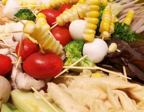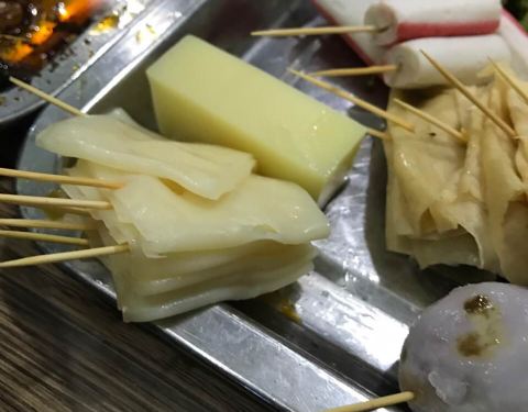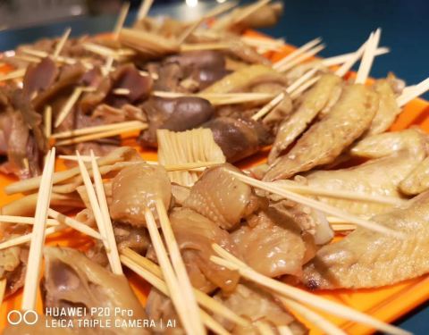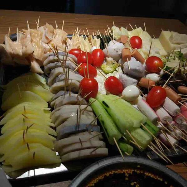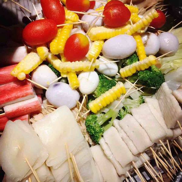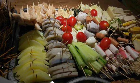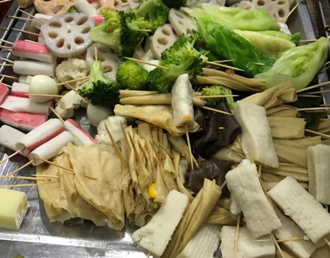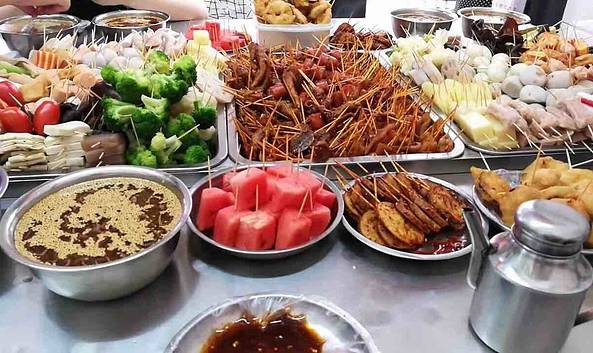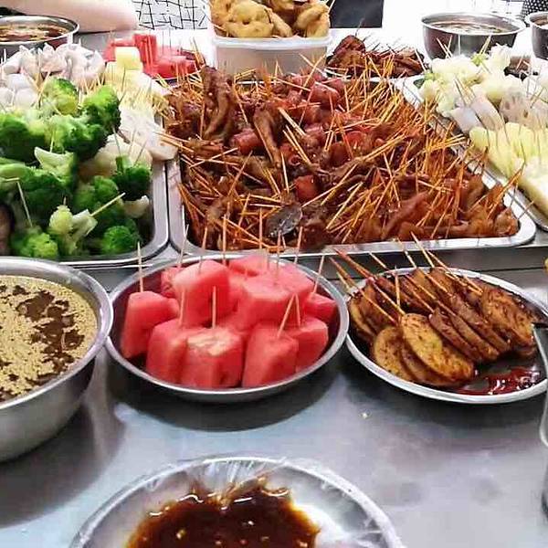 - 味道还不错,价格很便宜5毛钱一串,用牙签穿成一小串一小串的,荤菜和素菜都有,还有水果,自助选菜...