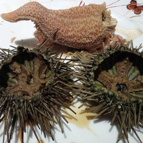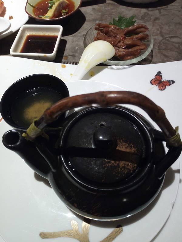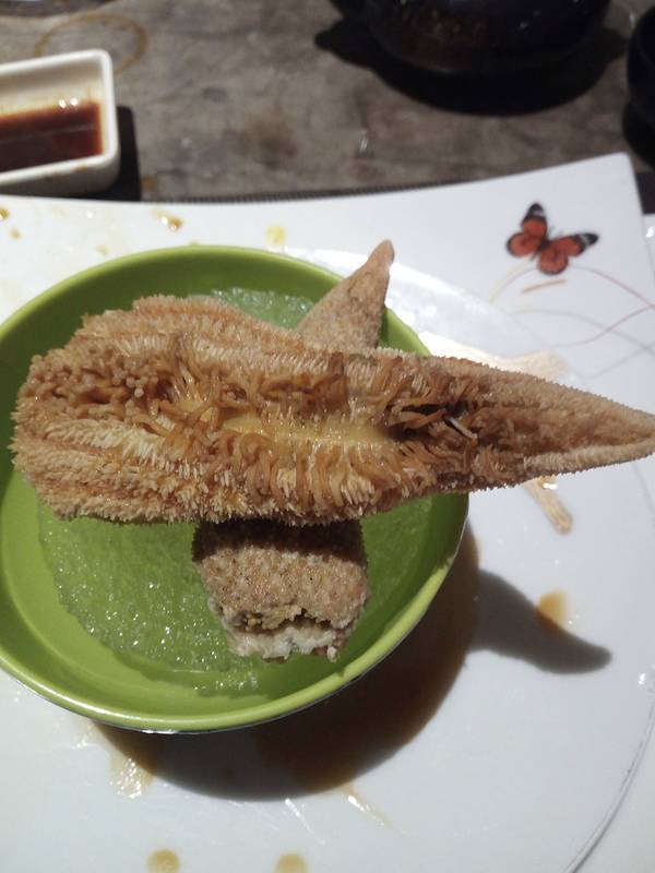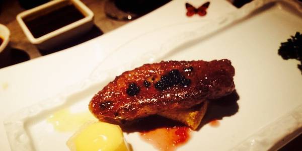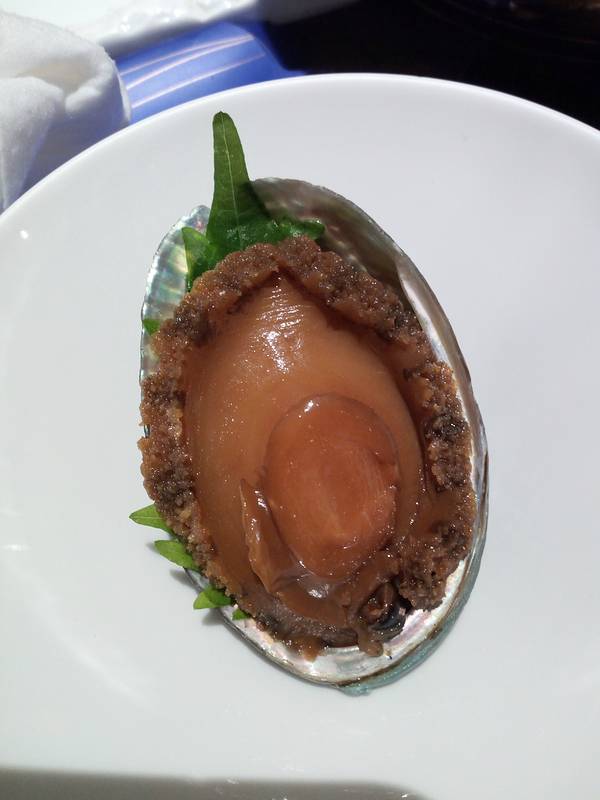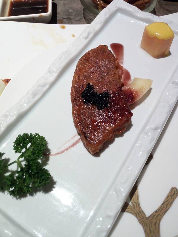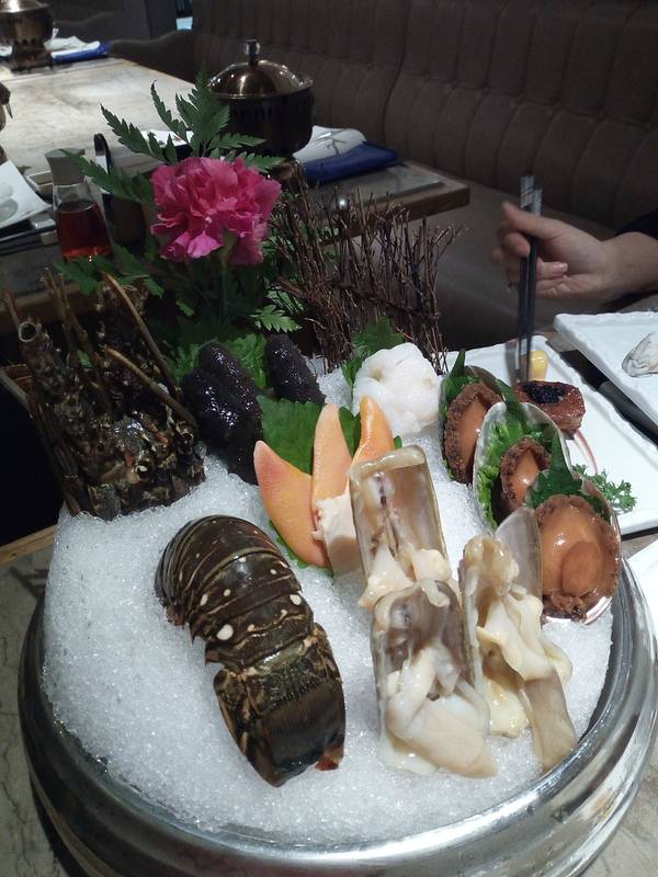 这家餐厅需要提前预定位置,来时由服务员引导入座,基本都有头盘海鲜姿造,如龙虾刺身,红酒鹅肝,阿根廷红虾、新鲜海胆、鲍鱼等等奢华食材,头盘拼盘看人数的多少决定大小,另外还有一份鱼翅羹。