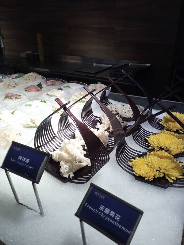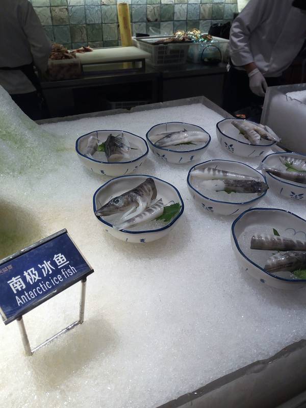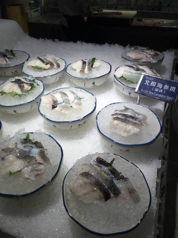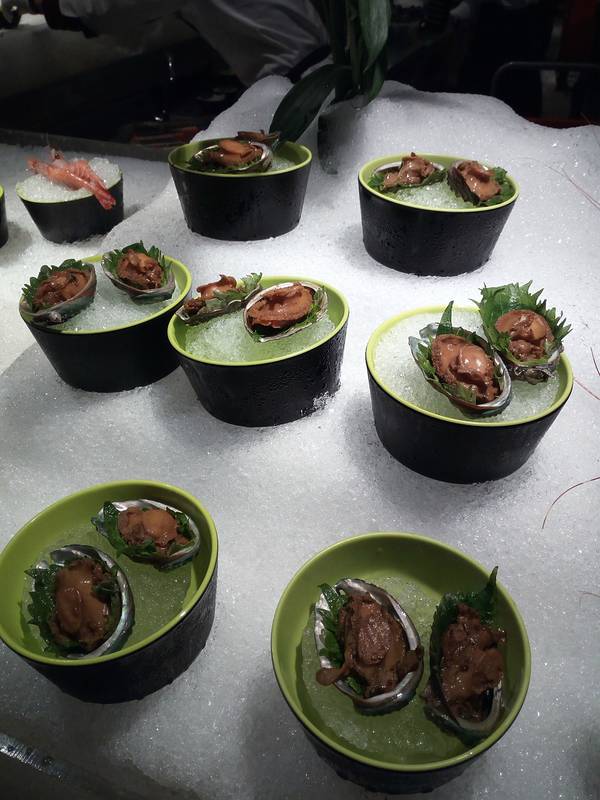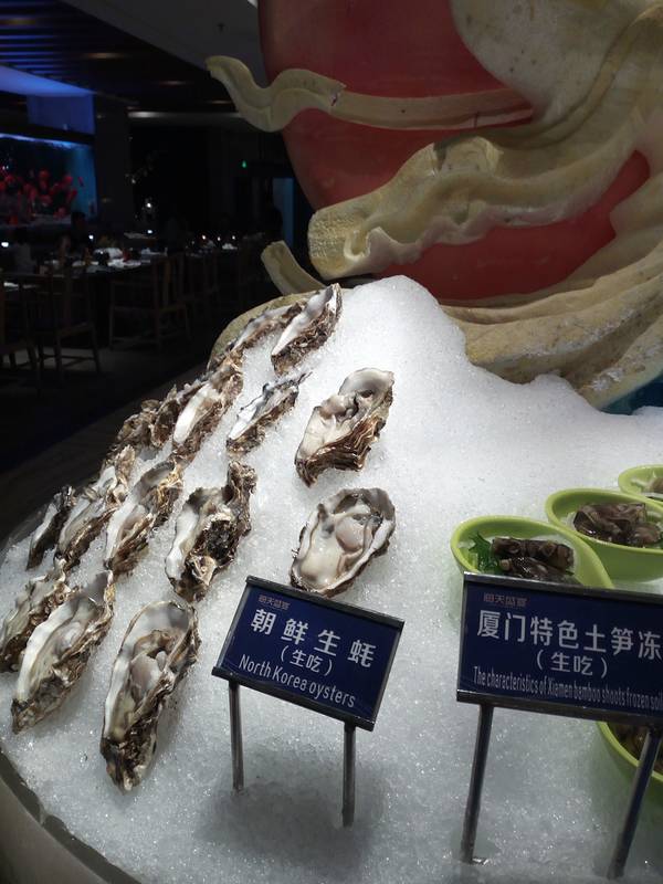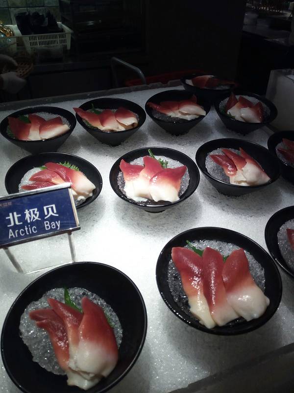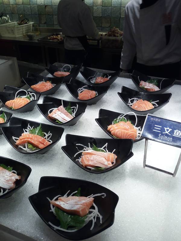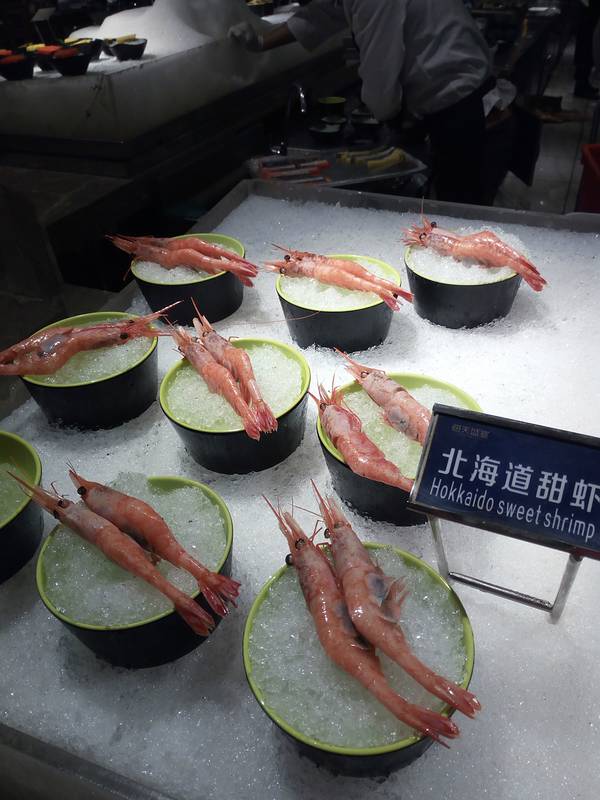 这家是自由取食,转了一圈取食,首先看到三文鱼是标配,满满当当摆在台上,粉嫩惹人爱,但在这家餐厅算是很少人拿。来自加拿大的牡丹虾,朝鲜的生蚝、澳洲的海星,新西兰的鳌虾,法国的菊花,南极的冰鱼,北极的海参斑,阿根廷的红虾、智利的帝王蟹、泰国的黑虎虾……不出福州,吃遍全球海洋美味,大家好像都盯在这些上面。