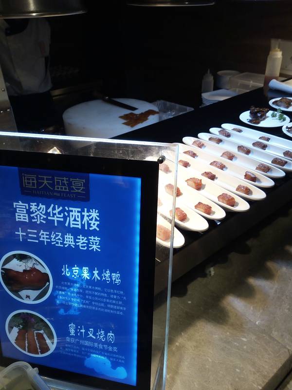 烧烤区豪气的烧烤师傅将各色海鲜制成烧烤,帝王蟹脚、扇贝、生蚝,统统撸起来。不过这边特色好像富黎华的招牌叉烧,可以试试,还有香煎鹅肝,不过吃多了会腻。