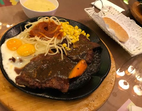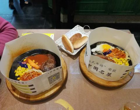 - 哈哈,老公这个牛排里面的鸡蛋竟然是双簧蛋。服务态度还不错!端午节的原因吧,人太多