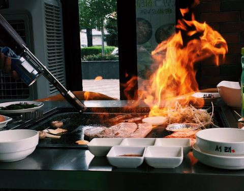 - ...占据整张桌面,把食材都放在烤盘上洒酒喷火,猪五花、猪皮、猪大肠都是用特制的火焰枪喷火而成,很爽