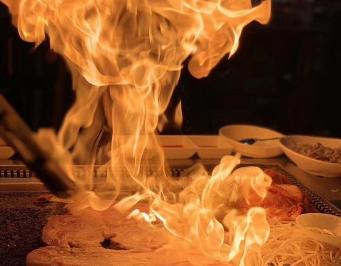- 不论被谁浇熄 面前再来吃个网红铁板烧烤。看这个大火就知道新年一定会旺旺旺的啦,讨个好彩头,味道也不错
