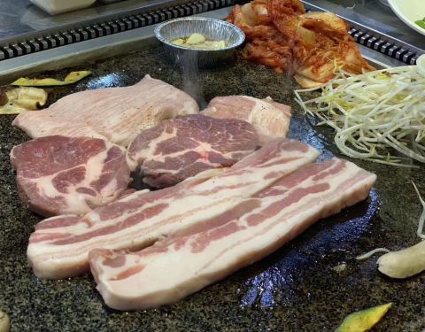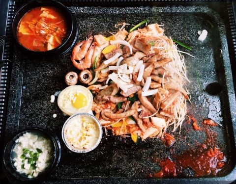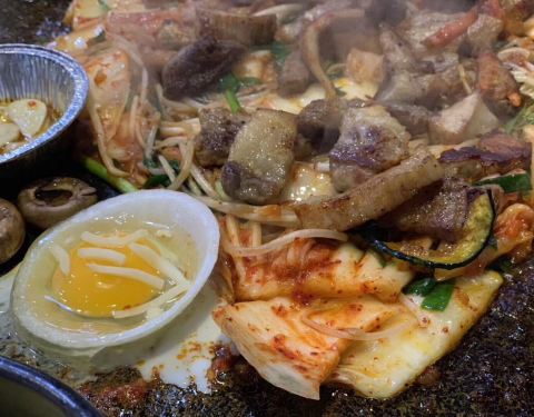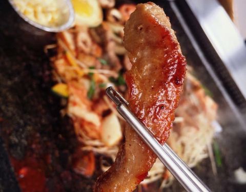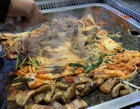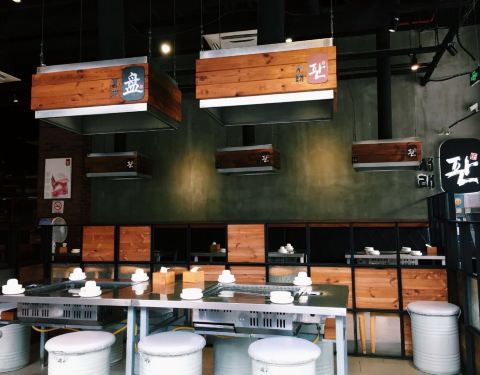 店挺大的,很宽敞。济州岛特有的石盘,几乎占据整张桌面,把食材都放在烤盘上洒酒喷火,猪五花、猪皮、猪大肠都是用特制的火焰枪喷火而成,很爽。套餐量很大。剩下的食材可以做炒饭。