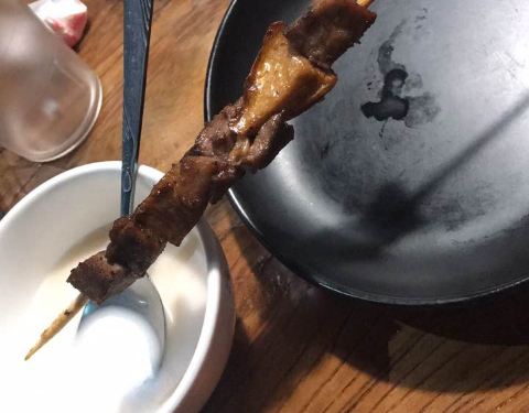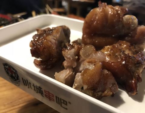 猪蹄烤的不入味,不会再点。肉筋和鸡软骨较肥腻,吃两串就吃不下去了。 五花肉烤的却很焦香香的,蜜汁排骨和麻辣排骨不错。疙瘩汤特别好喝。屋内温度好。 云皮第一次吃,不错
