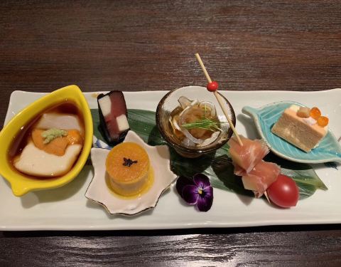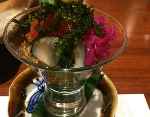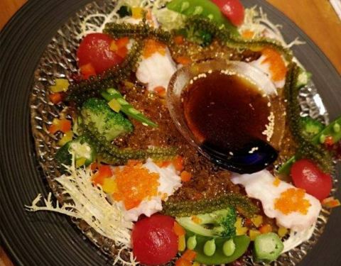 赤海胆寿司,海胆堆满了,鲜甜细嫩,和一点点酱油配合的正好。 白身鱼蔬菜增味汤,拿鲷鱼头煮的,入口很腥,吃了点鱼肉有十分鲜甜,汤中的蔬菜很新鲜。 特制秋葵,切的细细的秋葵和山药,黏黏的口感,配合着木鱼花蘸酱油还不错。 和风蔬菜沙拉,蔬菜很新鲜,芝麻酱很浓郁。