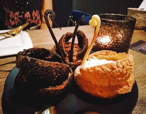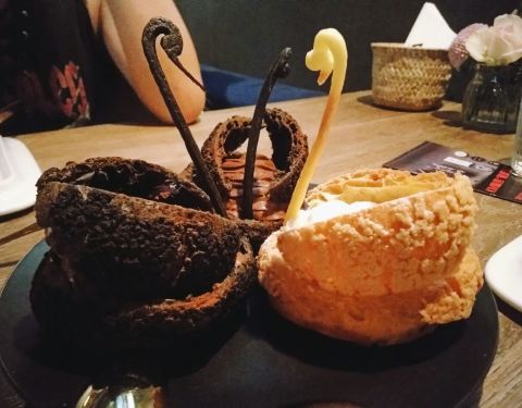 - 菜品肯定必点天鹅泡芙,口味就是脆皮泡芙造型非常漂亮,分香草跟巧克力。三文鱼卷不推荐大家点,咸苦