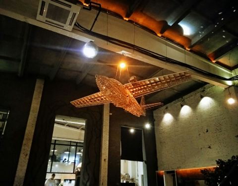 废弃的锅炉房改造成工业风的餐厅,顺着不起眼的大铁门往里走有很大的停车场,顺着指示牌寻到正门,门把手是扳子做的酷,一进门是衣服店,再往前就是餐厅,棚顶有一架木质大飞机,右手边是森林风格的包间,还有榻...