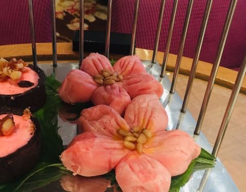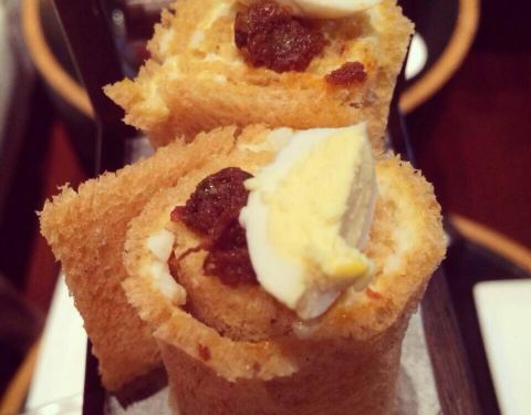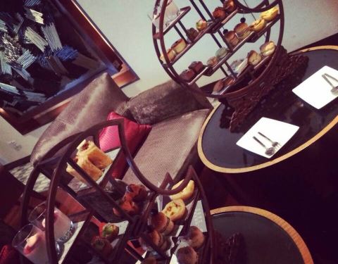 四个人团了两份双人下午茶的套餐,从酒店正门进去左边就是了。双人下午茶的套餐,很实惠,价格不贵,量很大,比其它下午茶的分量都要足,各种甜点都是双份的。装甜点的托盘是中式的,很特别。关键是,出品也很不错。马卡龙的甜味恰到好处,口感是外酥内软,饼的表皮和饼底的裙边是酥脆的;Mini小汉堡超级cute,一口正好;超级喜欢的是水果慕斯杯和巧克力慕斯杯,味道浓郁,但又不腻。除了甜点,茶可以挑选的种类也很多,点了卡布奇诺、绿茶和两份黑加仑茶,黑加仑茶很特别,味道一级棒。