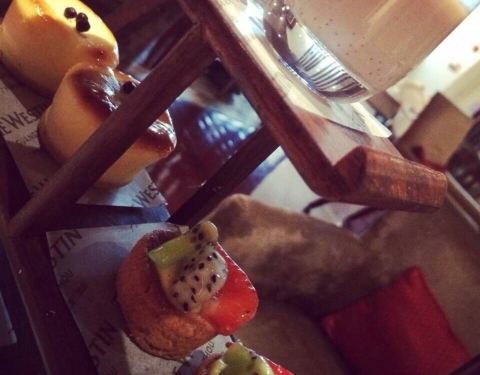 东站附近的海航威斯汀 大堂吧在一楼左手边,空间不大,需要提前预约。提前一天约的套餐,到现场后等了10多分钟后上齐 整个大堂吧氛围比较阴暗,光线很差。 虽然是一楼,但是灯光效果真的是有点差。 甜品味道一般,品相OK 饮品点了西瓜汁和草莓奶昔,草莓奶昔味道有点奇怪,不推荐。