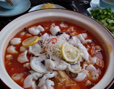 位于三钢里的青花椒鱼店,人气非常旺。青花椒砂锅鱼选用爽滑的黑鱼片,鱼汤酸爽、香辣、鲜麻,加上丰富的配菜,口感非常鲜美。这家店的飞饼和红糖糍粑也非常好吃!