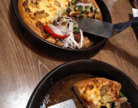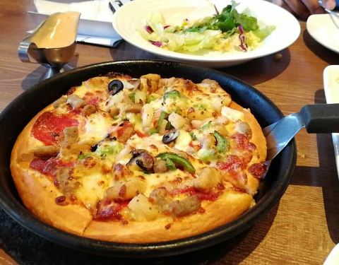 很久没来啦,还是中规中矩的味道哦。披萨的饼有点厚了,芝士少了,还可以吧。