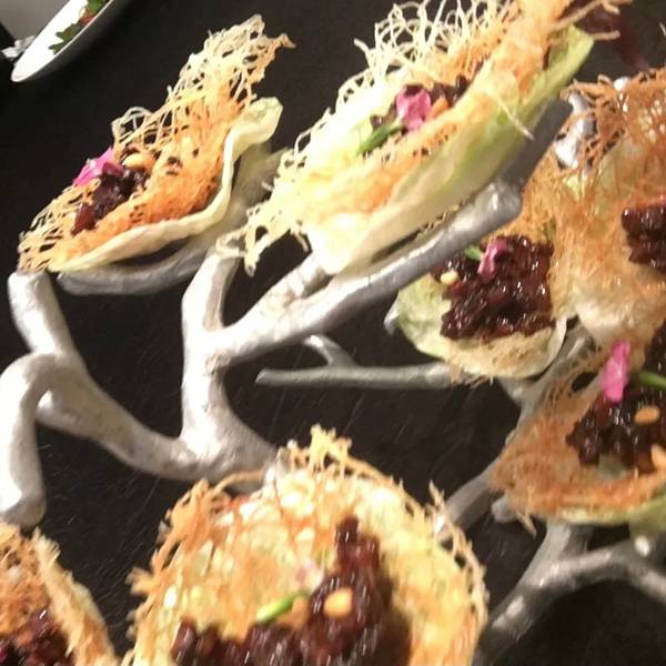 环境非常高大上,金碧辉煌的,人气旺却很安静,服务品质很好。大董的鸭子皮下真的只有薄薄的一层,完全不腻,也不会因为油脂不够而显得柴,瘦肉也很嫩,肥瘦适中,鸭皮酥脆不腻。卷烤鸭的饼皮也是很重要的部分,饼皮很软薄,不缺嚼劲。皮和酱料摆盘特别好看,圆圆的一圈酱料,有传统的也有蓝莓酱料和芥末酱。