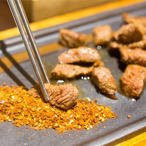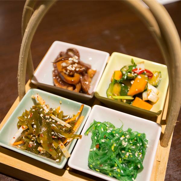小食烩由酱南瓜、酱鱿鱼、海草、海带4款小吃组成,微辣的滋味是打开味蕾的好帮手。铁板牛小排
