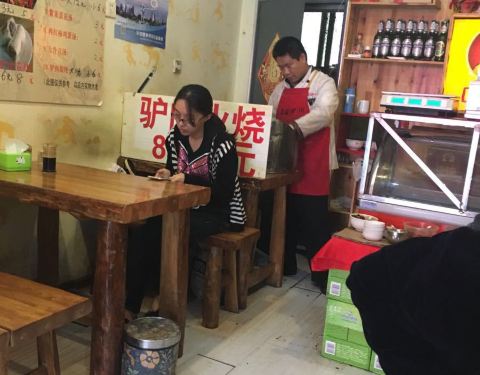 这家店店面不大,看着比较拥挤,就几个桌椅,不过看着卫生条件还不错,主要就是驴肉为素材,源于高唐县驴肉之乡,有驴肉火烧8元和五元的,卷饼10元和8元,驴肉汤小碗的8元!还有一些炒菜,感觉驴肉火烧挺好吃的,不比河间的差!驴肉汤有些咸啦!炒菜一般的土豆丝十元,辣椒鸡蛋饼12元,总的来说还可以的一家小店!