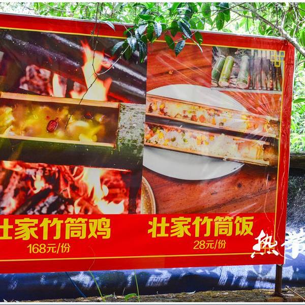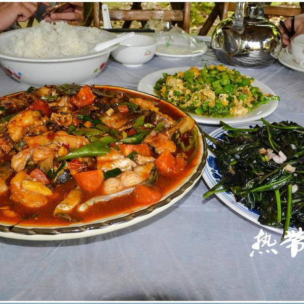 阳朔啤酒鱼 沉侵在遇龙河的美景中倒是不觉得肚子饿,回县城的路上神经一放松饥饿感排山倒海的压过来了,在吃的方面我们是最有默契的,于是对包车师傅各种献媚各种套近乎,目的就是想要吃正宗的阳朔啤酒鱼,师傅架不住我们糖衣炮弹猛烈的攻势,竹筒倒豆子般什么都招了,哈哈! ▼ Tips —————————————————————— 总结一下师傅的经验: 1、在阳朔想吃正宗的啤酒鱼,不一定要去那些什么大师傅啤酒鱼、谢三姐啤酒鱼这些出名的店,越出名的店价格就越高,因为不管是门面装修还是地理位置高成本都要嫁接到这些食客身上的,偏僻点的普通大排档同样也一样能吃到正宗的啤酒鱼,因为地段偏僻成本低,价格也会比较实惠。 2、啤酒鱼可以用很多种类的鱼来做,味道也会有所不同。鱼的选择建议不要选择店家推荐的稀罕鱼种,稀罕的鱼种价格一般都很贵,价格贵做出来的啤酒鱼不一定就好吃哦,而且下锅煮熟了后你也不知道究竟是不是你点的那条贵的鱼呢。(这样的分析太精辟太到位了)所以选择一般的草鱼、鲤鱼就好啦!我提议想吃阳朔本地特色的菜,最好环境也能好点,不想去人多的餐厅吃饭。包车师傅想了一下后建议我们来到了这家山庄式的餐馆,位置比较不好找,车子貌似在很窄的城中村一样的小道七拐八拐才到的,这个位置叫月下篱笆,就在月亮山的山脚下。▲————我是第一次见到绿色的扫码单车,也不知道是不是共享的,有很多年轻游客都骑着这样的车游览风景。▲————包车师傅特地停了一会车告诉我们这是阳朔很受中内外游客欢迎的攀岩地。怎么样?有没有跃跃欲试呢?▲————一进门就看到了农家饭在门口放的广告,当时饥肠辘辘的我们看到更是经不住吞口水▲————穿过一个小棚,塔台一看,蓝天、绿山和红花,我没猜错的话,这应该是三角梅吧?▲————向左转移镜头,就能看到月亮山啦,感谢大自然的杰作给我们带来了一个个惊喜▲————农家饭馆内的假山一角▲————没多一会儿,这美丽的景色就吸引了一批美眉来拍照,单纯拍照噢,看她们拍完照就走人我当时还是有点讶异的▲————老板娘做的竹筒鸡十米开外就闻到香味啦▲————这道菜有3种酿,辣椒酿、豆腐酿、荷包蛋。额....为啥只说了两种,因为这道菜用的是田螺肉跟猪肉一块儿剁的馅,就当3种吧=。= PS:这是真咸啊,一口下去齁得我呀。。。。建议如果想吃这道菜,要提前跟老板娘说少点盐噢!▲————这是我们所有的菜,加起来也就200+。啤酒鱼、酿、野菜汤、红背菜、辣椒炒蛋(这是我最喜欢的一道噢,很有家常饭的味道!)▲————我们选择是用草鱼来做啤酒鱼,份量很足!师傅说要看啤酒鱼做的好不好,首先得要看汤汁稠不稠,汤汁越稠鱼肉也就是越入味!