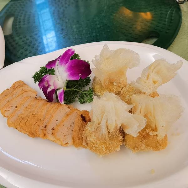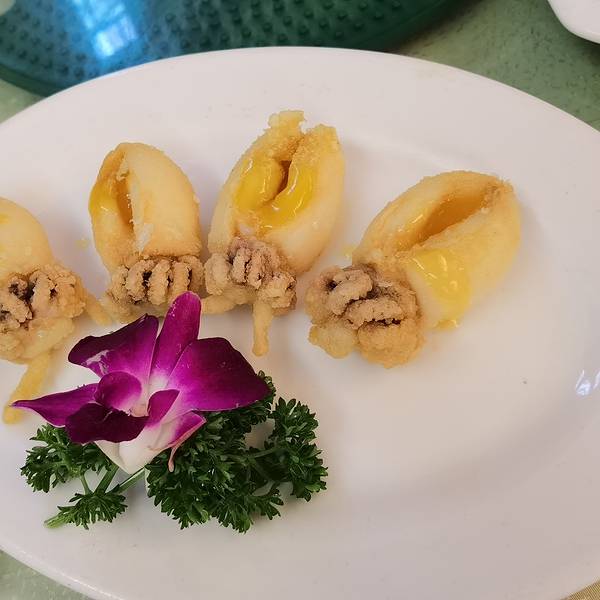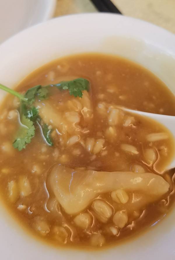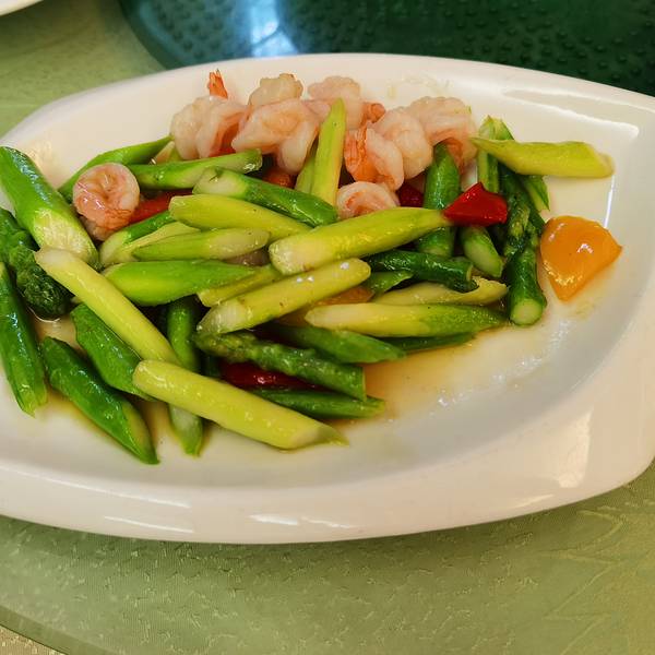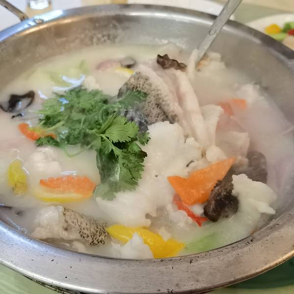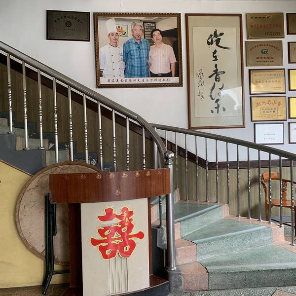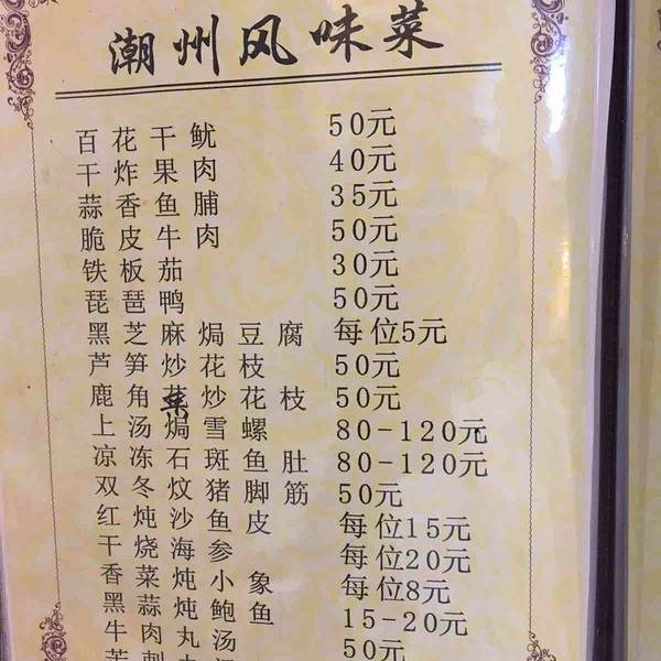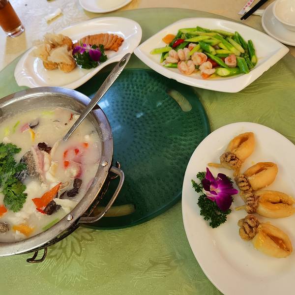 酒店前台的本地人推介的潮汕本地菜馆,味道不错,感觉挺正宗的,本广东人觉得薏米煮花胶,很鲜橙汁墨鱼,肥美有一点点辣的石斑鱼本地鱼饼🐟,不错鲜虾点菜的量按人头点的很有年代感的酒家