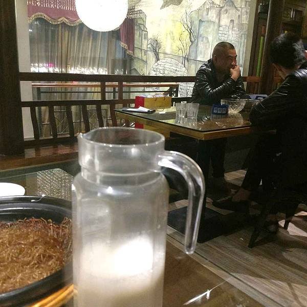 酒品饮料:这里白酒,啤酒,红酒,都有。还有特色自酿的烧谷酒,白酒加水果泡的酒,杨梅味的感觉口味正好,4元一两,来了半斤。还有烧谷酒60度,来了二两尝尝。口味有些冲。价格也不便宜。要20多元一两好像。猕猴桃味的8元一两,看着和啤酒的颜色差不多。另外这的豆浆很有特色,也蛮畅销。是大铁锅熬制的,在门口就可以看到,15元一扎杯,大概有1500ml。口味蛮香的,不加糖都有甜味。两个人不到200就可以吃的很不错。
