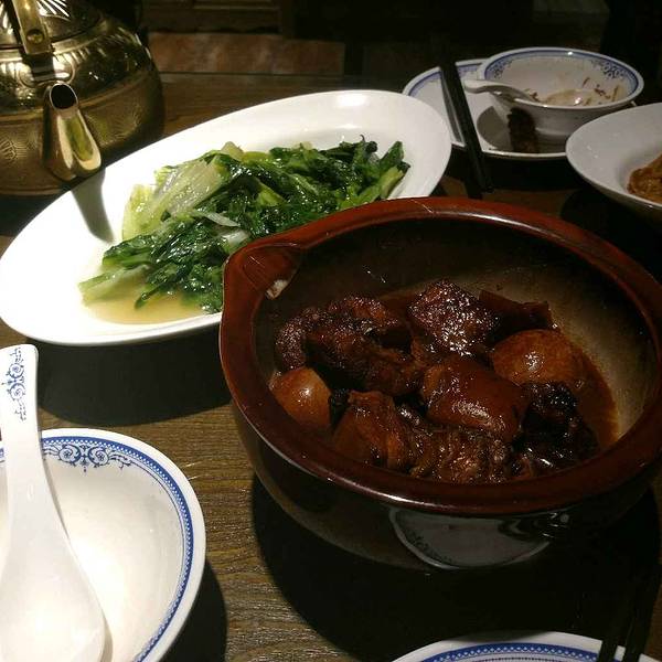 常福人家在武汉有多家店面。主要是以本地特色菜为主。装修风格也蛮有自己的特色的!外观看着也挺明显的标志。常福人家几个字很容易就看到。进门就是一个古典的招牌立在门口,有绿化盆栽。旁边是服务台,可以取号,安排座位。然后点菜。点菜区过服务台就是,以地方烧菜为主。都是那种大锅提前做好的,然后有的再料理下就可以啦,因此上菜速度非常快,当然也可以要求慢些时间再上菜也可以。这次因为就两个人来的,简单点了几个菜,首先这的特色菜就是红烧肉烧鸡蛋。48份一份,这个菜口味没问题,红烧肉的火候也刚好,鸡蛋经过肉的混合也有别有的香味。不过就是量少些。还一个是笋干35元好像,蛮脆香的,不过口味一般个人感觉。再就是特色粉丝28元,这个和肉末粉丝的口味差不多。只不过这个是砂锅的。油麦菜可以,蛮清淡的,15元。