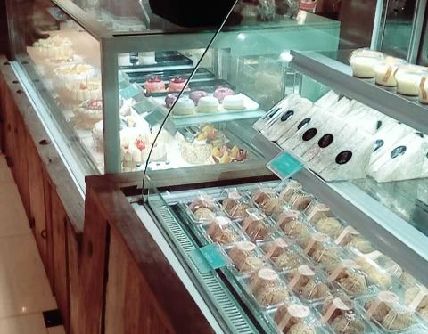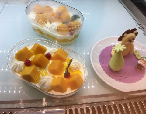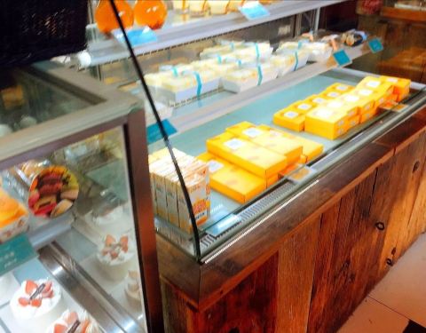 ...要装修挺好,可以看到里面做蛋糕,然后这有三个凳子可以休息,但是热牛奶不是很好喝,热可可也不好喝