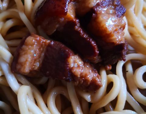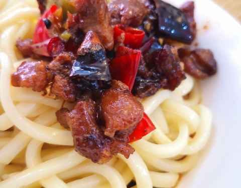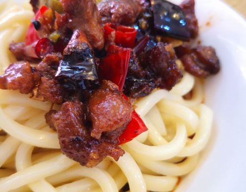 去吃坝坝面,人家正在洗过,说周六只营业半天,周天放假。于是我盯上了街对面的这家面馆 大太阳已经把店招遮完了,走进才看到一个曾记 面的品种很多,一两八元,二两十元,三两12。好记好算账。 可以自助面汤和泡菜,泡菜不能浪费要吃完,不然收费两元。 面条是棍棍面,但是面条本身偏硬,要了三个一两,第一碗最硬。 第一碗素椒杂酱,干拌,调料是最喜欢的,面是最硬的一碗,里面加了麻酱我非常喜欢。 第二碗,招牌排名第一个的海椒鸭面,干拌,偏辣,鸭肉紧实味道不错,但是辣还是主角 第三碗,烧肉面,清汤口味,三坨红烧肉很巴适,但是这碗面最好的也就是这三坨肉。面条不管是味道还是口感就一般了 还是素椒好吃