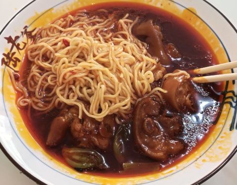 在文化路下段,店面不大的地方,但顾客盈门,还有很多外卖小哥等着单子。可见这家的生意有多好了。 看着颜色以为很辣,但一点没有,非常合适。 猪蹄是招牌,不油腻,很糯。卤的非常香。如果面条配的四五块不够,还可以再来一份小的,大快朵颐。其它还有米线,米饭,卤蛋。