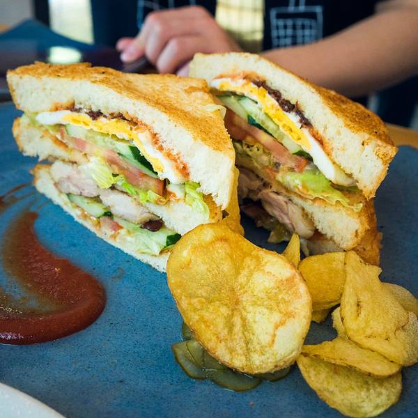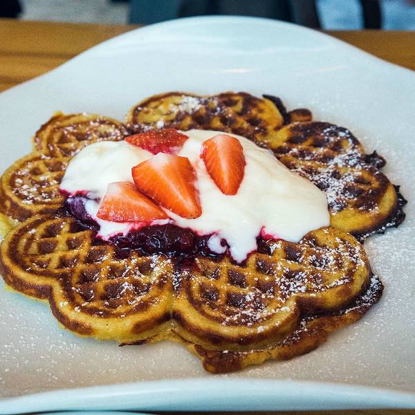 蒸煮恰到好处流黄的鸡蛋陪在烤的松脆的面包上,还搭配了爽口的蛋黄酱,丝毫不觉得腻哦。毕竟还搭配着生菜解腻呢。看到那些紫红的小块肉丁了么?那个口感像是牛肉干一样,不过味道又像是培根,给满满的鸡蛋口味增添一点咸咸的味道。一般的waffles会跟松饼一样是松软奶油的甜,不过这个梅子的waffle确实咸口味的。不过配上酸爽的梅子酱,顺滑不腻的奶油,还有新鲜的草莓,整个味觉相当的充实,从咸到甜,从软到脆,也是不俗的一道早餐甜品!这道三明治量可是着实的惊人!两只手都不能完全抓住的3+2!!三明治的面包烤的恰到好处,外脆内软,夹着超级足量的鸡蛋、黄瓜、番茄、生菜,上下分别夹着培根和烤鸡肉!荤素搭配绝对超值!