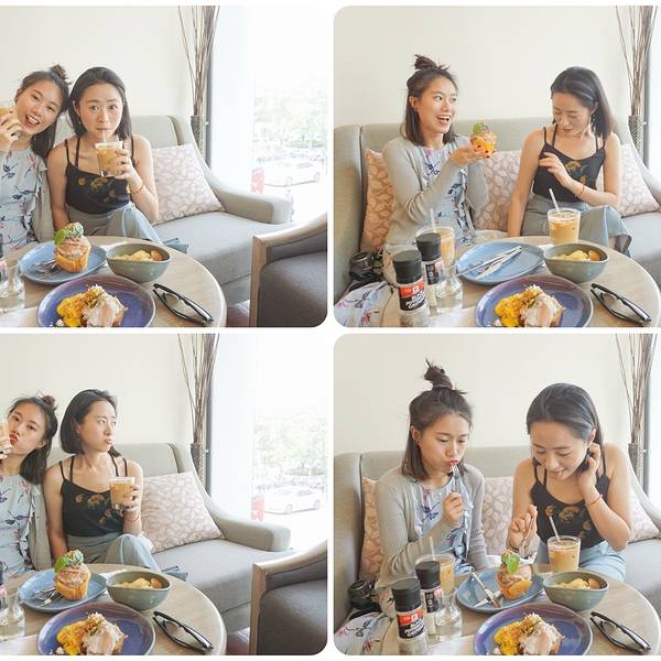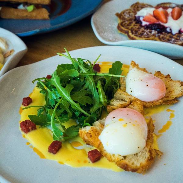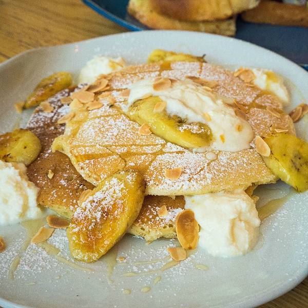 也可以像我们点一些不一样的,只为了好喝的。40同学偏爱莫吉多,点了一杯类似的,不过其实里面浓浓的黄瓜水的味道,特别的沁人心脾;涛宝宝爱喝酸的,点了一杯百香果系列饮品;我爱喝甜的,有恰好看到这杯泰式奶茶的推荐就尝试了一下,味道很奇怪的能够喝出一股粽叶的味道来,不知道是加了什么样的配料。松软可口的pancake一般都只是配上黄油,以及甜而不腻的蜂蜜就已经很美味了。可是这家店却搭配上了新鲜烤炙过的香蕉,再加上温软顺滑的奶油,还撒上果仁加以提味。真实甜腻到了你的心窝里!每一口都幸福感爆棚!这道早餐简直了!首先如果你不爱吃流黄半熟的鸡蛋可以不用尝试了,哈哈。