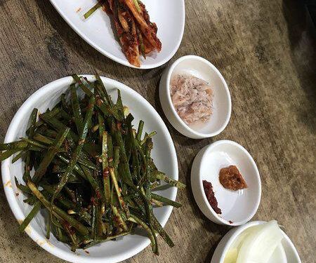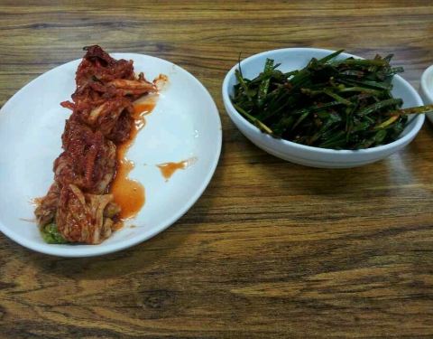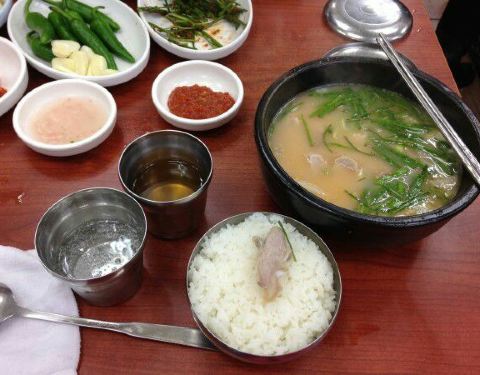猪肉汤饭是韩国的特色美食,本钱猪肉汤饭位于火车站旁,汤饭包括猪肉汤饭、血肠汤饭和内脏汤饭等。餐前小菜是一整条的韩国泡菜和生的青椒大蒜。随猪肉汤饭上桌的还有用来调味的大酱和虾酱,以及放入汤饭中同食的生韭菜。 本钱猪肉汤饭上汤饭的时候汤和饭是分开的,汤底较为清淡,食客可以根据自己的口味放入虾酱和大酱,随后即放入生韭菜,猪肉汤饭里的猪肉片量非常的足,肥瘦相间,不老不柴。