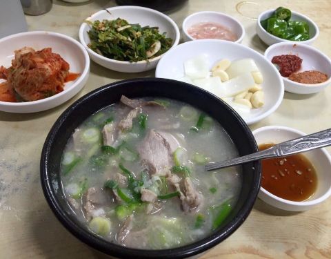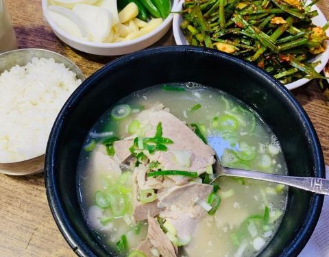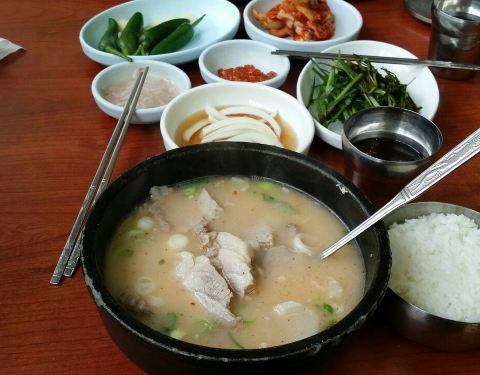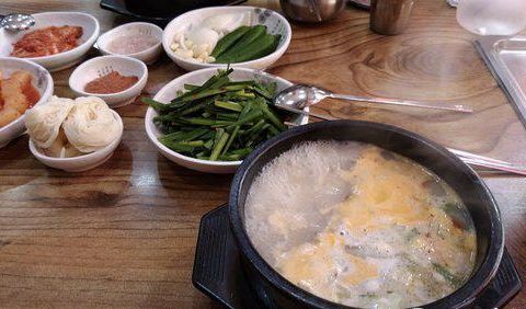 猪肉汤饭是韩国的特色美食,本钱猪肉汤饭位于火车站旁,汤饭包括猪肉汤饭、血肠汤饭和内脏汤饭等。餐前小菜...