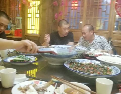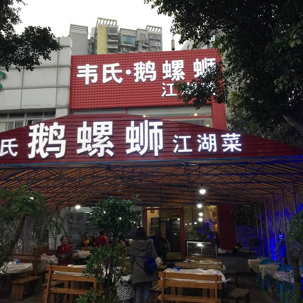 逛完解放碑,导航重庆人气美食,首推了这家店,按照地址走到这里。后来才知道韦氏鹅螺蛳有3还是4家店,稀里糊涂的吃完也不确定我吃的是不是回龙湾分店的,但是味道非常不错。大家可以根据所在位置确认下哪家分店最近,再在网上团购代金券,代金券是有门店限制的。如果是自驾游的朋友,尽量早点到,停车位不是很足。 点菜时,大姐那叫一个热情,翻到这一页,就指着某道菜说这个好吃,翻到那一页,就指着另一道菜说这个也好吃,结果就是我们两个人点了8道菜,很难取舍休掉哪道菜,就干脆都娶了。饭店就是一个大排档,我们点菜时人还不是太多,等到水凉了,人就慢慢上来了,等到端上菜时,已经人声鼎沸了,整个棚里面高谈阔论声连绵不绝,此起彼伏。 上菜速度非常快,端上来一看,就知道是非常有地方特色的市井菜系。最喜欢牙签牛肉,酱香浓厚,味道非常赞,略微偏甜,和平时吃的偏辣的不太一样,就是肉筋比较多,我牙缝大,结果老塞牙。招牌菜--鹅螺蛳也很好吃,平时都是夏天才能吃到,想不到在这里,春寒料峭中也能吃到河鲜,而且好大个,肉质却不老,很入味,味道偏咸,很多花椒,重口味,如果不是点了太多菜,我都想再要一份。鹅掌感觉要比其他地方吃到的要软一些,虽然重庆离成都不算太远,同属川菜,但是感觉两者大排档的口味差距还是不小的。其他的菜也很好吃,只不过2个人实在没那么大的肚子,这会儿真羡慕大熊,谁让自己没有小叮当,不能把这些美味打包保存。 买了两瓶当地非常有名的饮品,在网上的游记中看到的,有些类似西安的冰峰,反正就是去山城旅游一定得尝尝这个。ps 味道没有网上描述的那么神奇,就是普通的豆奶了。还有要了一碗当地人很爱喝的酒糟蛋,吃喝了2口,不是太喜欢,还是江米甜酒好喝啊。 实际结账时,有点不开心。网购的团购券,76抵100,点了八个菜,卖家说只能使用1张,和我平时餐饮消费的小店那么不一样,而且还不给开发票,说是使用了团购券不能再开发票了。如果说76不开,我能理解,100不开我也能理解,可是剩下的几百我付的现金为什么不能开发票呢?不知道这种情况是不是针对外地人的。提醒在外就餐的朋友,付款时一定不要忘记索要发票,如果餐饮质量有问题,便于维权,自己的切身体验。